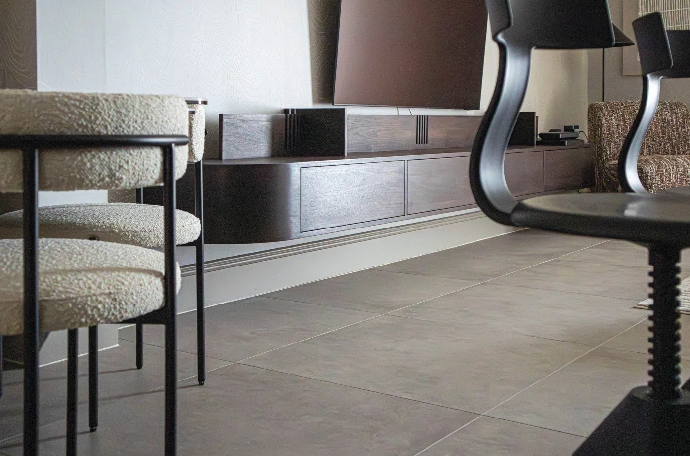 The living room is the soul’s gathering place—a space for conversation, for quiet evenings, for watching the river’s moods shift through the seasons. Here, the design sought to balance openness with intimacy, anchoring the room with a bespoke media unit that would serve as both focal point and functional marvel.