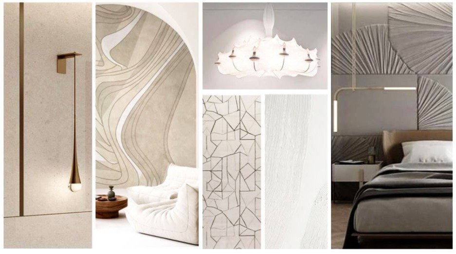 This concept board explores a light contemporary modern direction, blending sculptural lighting, soft textures, and layered wall finishes. Created for a Cambridgeshire bedroom, it sets the tone for a serene and tactile space — where clean lines meet quiet, expressive detail.
