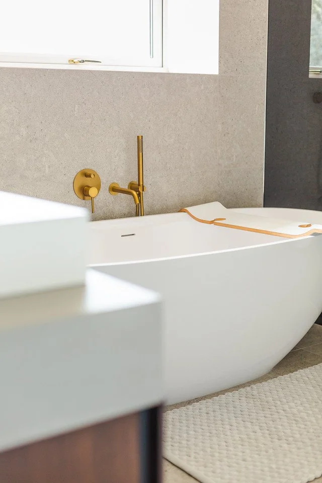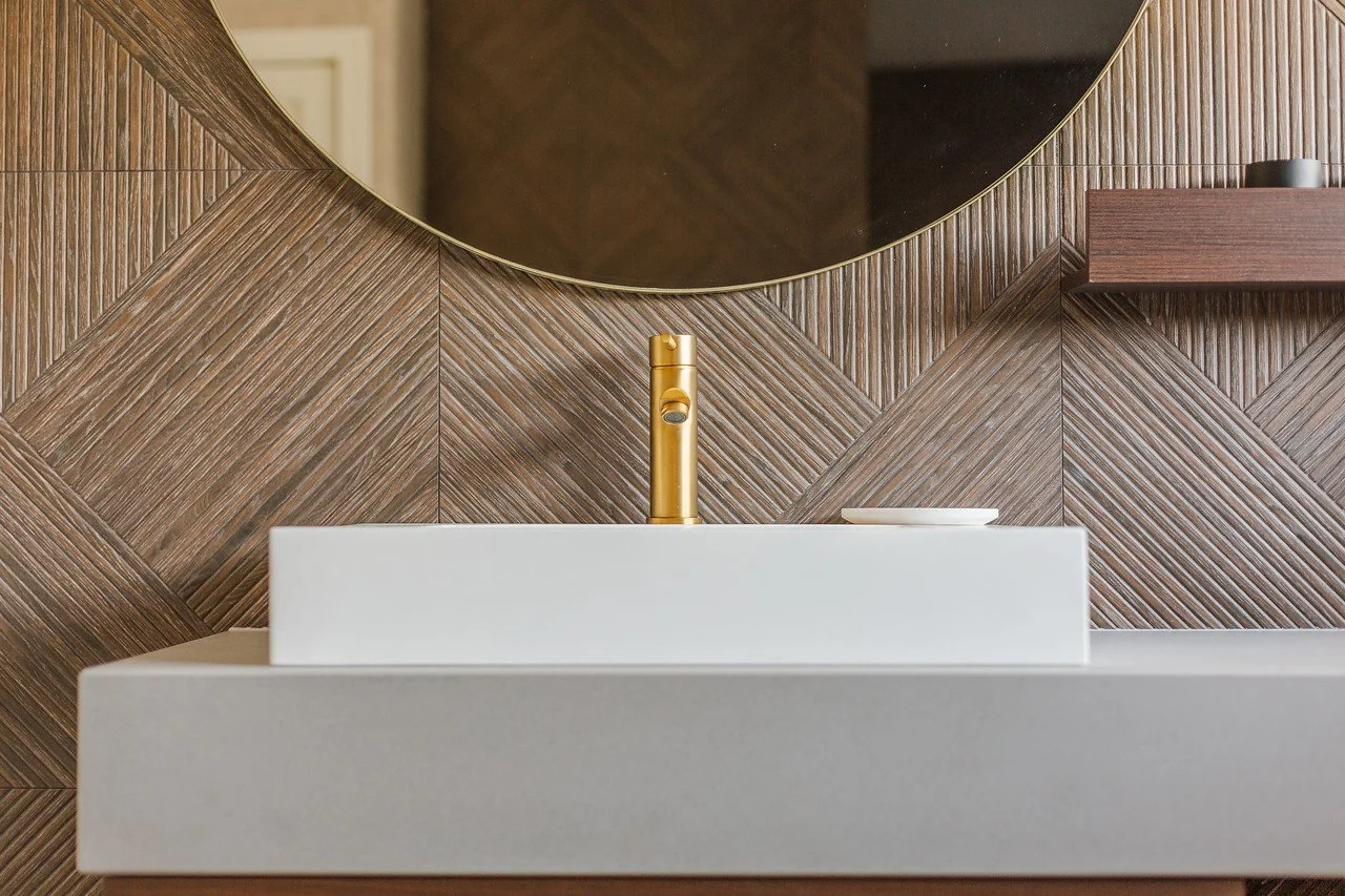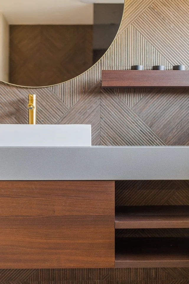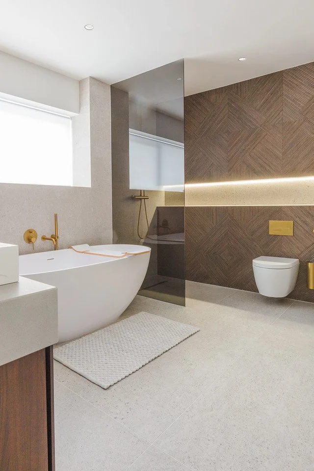 This family bathroom designed by our Interior designers in Cambridgeshire was a highlight of a luxurious and practical approach that caters to both aesthetics and functionality. Here's a breakdown of the key features and design elements: Client's Brief/Preferences: It's clear that our Interior designers took the client's preferences into account, ensuring that all desired functions, including a bath and shower, were incorporated seamlessly into the design. This client-centred approach is essential in creating a space that meets the family's needs. Smoked Glass Enclosure: The use of a smoked glass floor-to-ceiling enclosure for the bath and shower not only added an element of luxury but also created a visually appealing and cohesive look in the bathroom. It can also contribute to the sense of openness. Tailor-Made Vanity Unit: A tailor-made vanity unit is an excellent choice for maximizing storage space while maintaining a custom look. The inclusion of both open and closed storage ensures practicality and keeps the space organized. Durable Stone Countertop: The use of a durable stone countertop from Caesarstone not only adds an element of luxury but also ensures the longevity and durability of the vanity unit - Duravit. It's a testament to the focus on quality and durability in the design. Patterned Wall Tiles: The patterned wall tiles from Porcelanosa that replicate wood textures add a touch of warmth and cosiness to the bathroom. This textured feature wall can serve as a focal point and enhance the overall ambience. Layout Considerations: Careful attention to layout is essential in creating a functional and comfortable space. It's evident that our Interior designers have considered the placement of fixtures and elements to ensure an efficient flow and ease of use. Lighting and Fixtures: Proper lighting and well-chosen fixtures can significantly impact the overall look and feel of a bathroom. Our Interior designers carefully selected lighting and fixtures that show a considered and comprehensive approach to creating a luxurious and relaxing space.