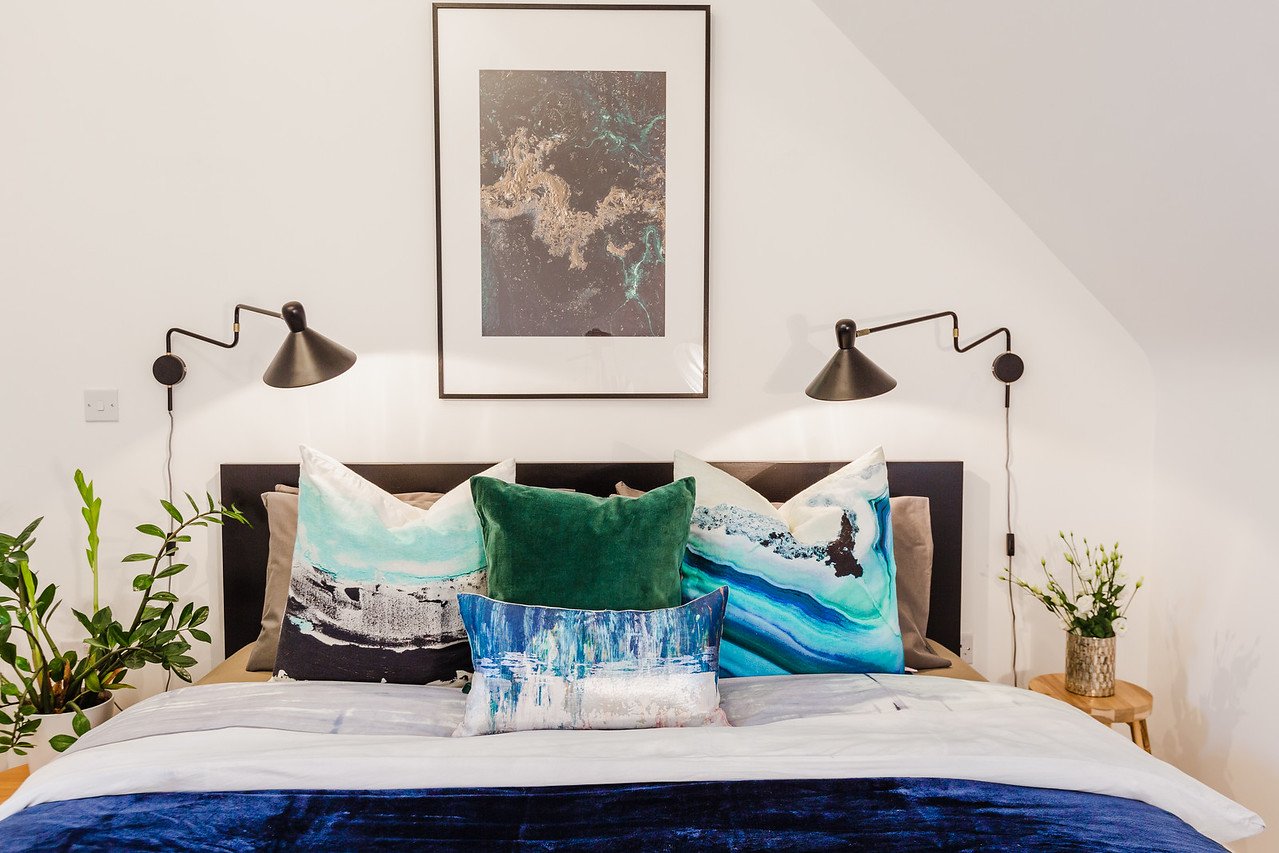 This master bedroom is shaped by a distinctly modern approach — clean lines, a restrained palette, and a focus on essential, purposeful elements. A neutral foundation is elevated with a deep, timeless blue that adds personality without overwhelming the space. Iconic furniture pieces introduce craftsmanship and historical depth, grounding the room in design heritage while maintaining a contemporary feel. Decorative elements are carefully curated to support a minimalist, uncluttered aesthetic, ensuring the space remains serene, functional, and visually balanced. The result is a bedroom that feels sophisticated, calm, and beautifully attuned to modern living.