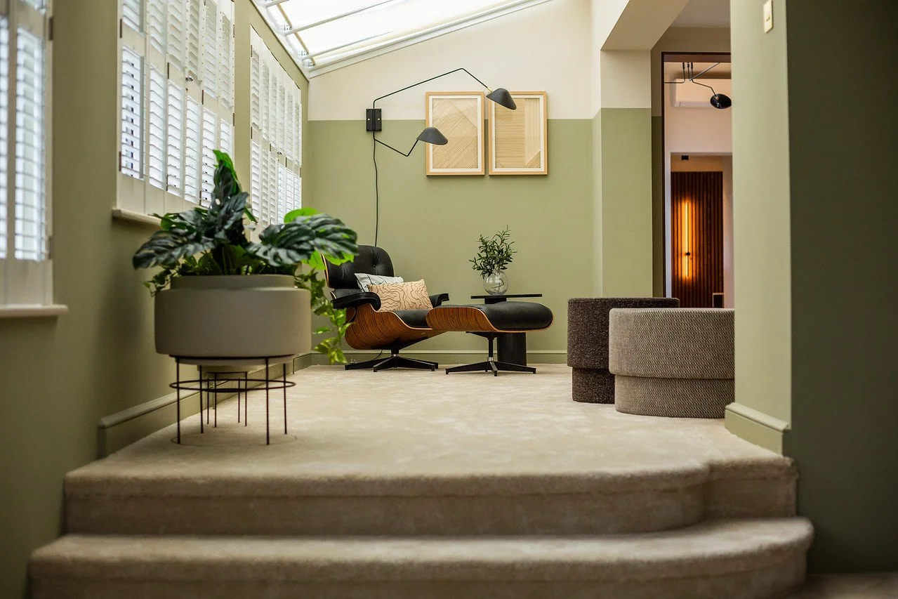 This open‑plan living room was designed to create a cohesive, calming atmosphere that connects seamlessly with the adjoining kitchen, hallway, and music room. A harmonious colour scheme establishes visual continuity, while thoughtful lighting, contemporary furniture, and Nordic‑inspired details bring clarity and warmth to the space. Every element — from textiles to accessories — is chosen with intention, ensuring the room feels balanced, inviting, and beautifully aligned with the wider home.